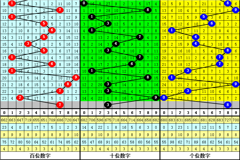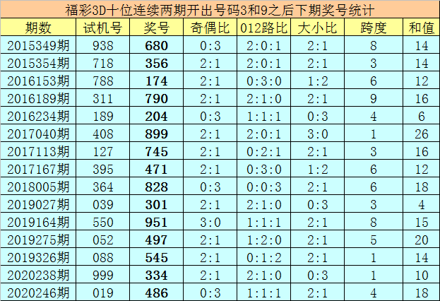 十位号码:前两期十位分别出现奖号3-9,历史上福彩3D连续前后分别开出号码3-9的现象共开出67次。在十位3-9的现象出现时,最近15期其下期分别开出号码:680-356-174-790-204-899-745-471-828-301-951-497-545-334-486;