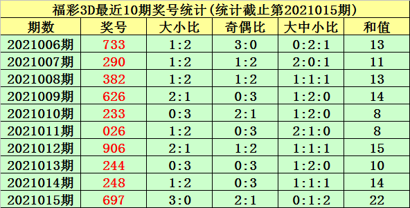 福彩3D第2021015期试机号为:161,奖号为:697。奖号类型为组六,和值为22,奇偶比为2:1,跨度为3,012路比为2:1:0,大小比为3:0。