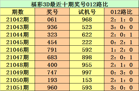 第2021051期3D奖号为960,试机号为593。形态:组六,奇偶比1:2,大小比2:1,012路比为3:0:0。