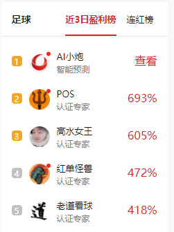 此外,红鹤9连红,红先生、红单长老、泡芙8连红,连红榜上一片欣欣向荣。盈利榜方面,专家POS盈利693%排名第一,值得多多关注!