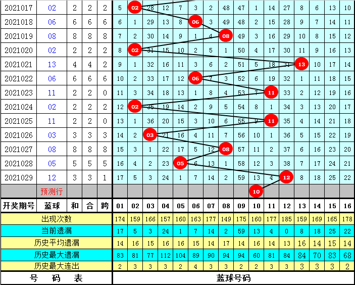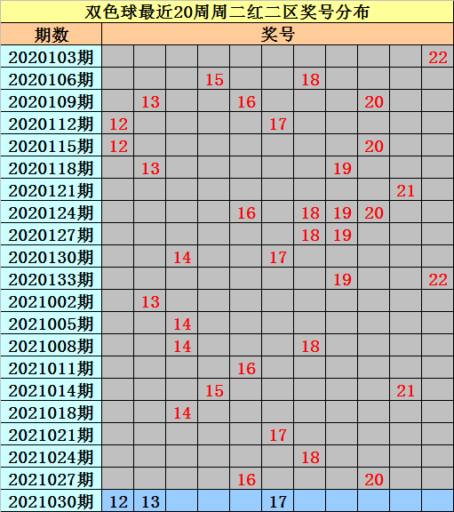 最近20个周二红二区18,表现最热,开出次数为5次,红球12、15、21、22,表现最冷,出现2次,上周二开出2个号16、20,本期该区参考号码:12、13、17。