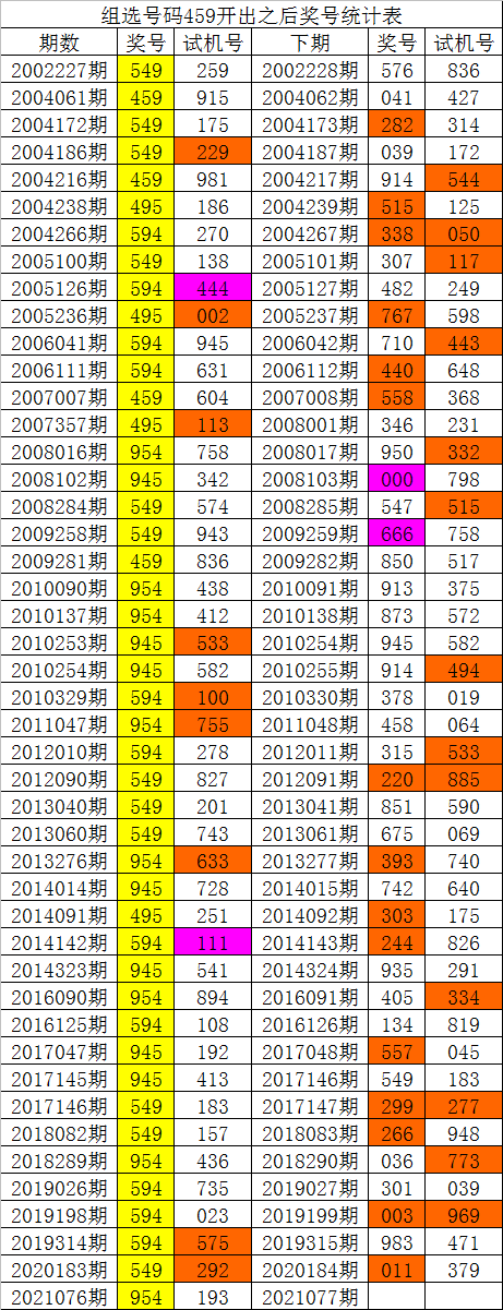 福彩3D第2021076期开出组选号码:459,该号码历史上组选出现了46次,其下期分别开出了号码:576、041、282、039、914、515、338、307、482、767、710、440、558、346、950、000、547、666、850、913、873、945、914、378、458、315、220、851、675、393、742、303、244、935、405、134、557、549、299、266、036、301、003、983、011,如图: