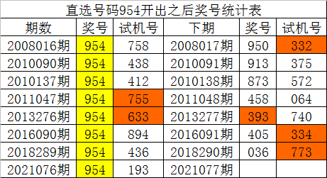 福彩3D第2021076期开出直选号码为:954,该直选号码历史上出现了8次,其下期分别开出了号码:950、913、873、458、393、405、036,如图: