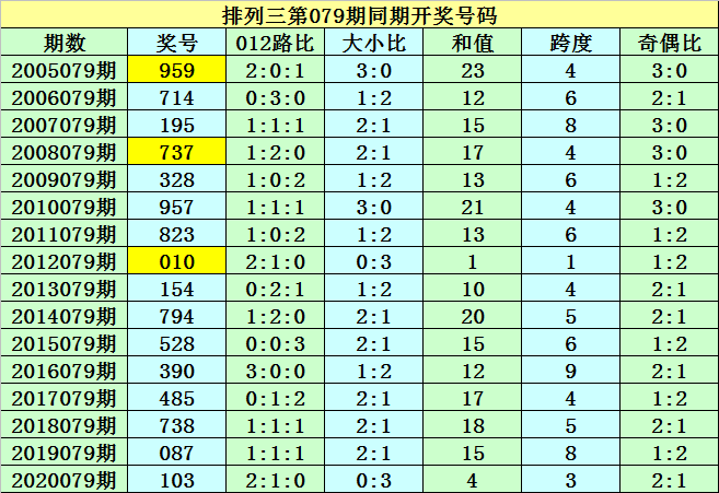 号码012路比:第079期历史同期号码012路比为17:16:15,本期预计012路比开出0:1:2。