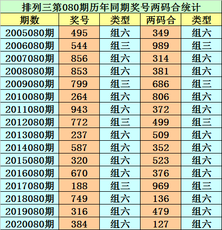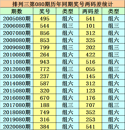 排列三从2004年开奖至今已开出5798期奖号了,其中第080期历史同期奖号出现16次,历年第080期分别开出号码:495、544、856、853、799、264、943、772、237、587、320、670、188、749、316、384。