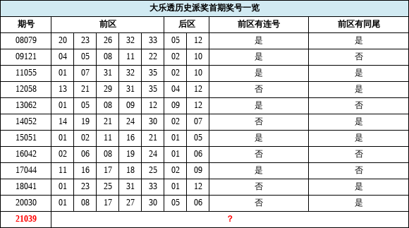 从上表的数据不难看出,在已经结束的11次派奖首期开奖中,前区开出连号次数为6次,属于正常概率范围;而同尾号则开出7次,占比超过6成。