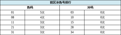 在选号时,冷热码通常都是重要的参考条件之一,那么在11次派奖首期开奖的号码中又是哪些呢?数据显示,前区号码01曾5次现身,而08现身4次,11、21、31都开出3次;03、10、15、28、34这5枚奖号在11次派奖的首期开奖中从未被摇出!