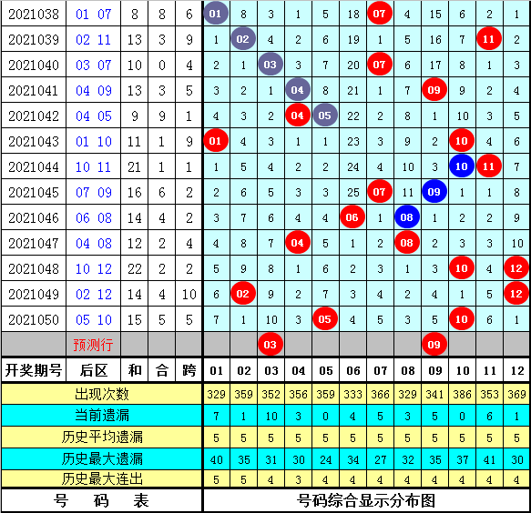在历史同期开奖中,后区号码和值奇偶为7:7,基本相等,本期适当关注偶号和值开出,参考和值12。