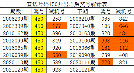 从以上统计可以看出,直选号码450出现之后,其下期奖号:1.下期偶数号码出现概率100%;2.下期2路号码出现概率100%;3.下期全质全合组合没有出现;