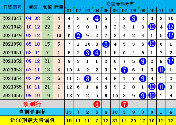 后区跨度分析:前十期后区跨度为4、2、10、5、1、3、4、6、1、1;本期注意后区跨度变大,两码参考:04、07