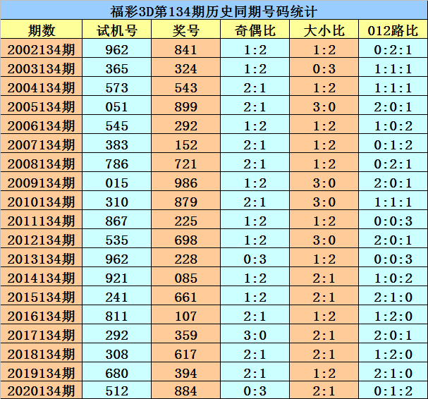 福彩3D第2021134期开奖日期:2021年5月24日,历史上第134期已开出了19次奖号,历年同期号码分别为:841、324、543、899、292、152、721、986、879、225、698、228、085、661、107、359、617、394、884。