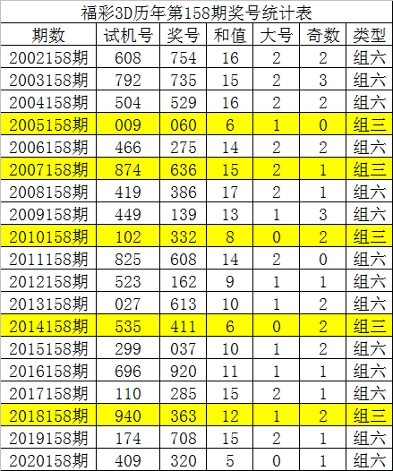 从以上统计可以看出,历年3D第158期开出了5次组三号码,开出了14次组六号码。组六号码出现概率大,本期预计开出组六号码。