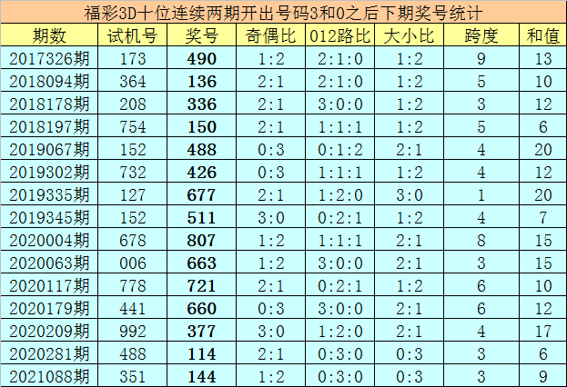 十位号码:前两期十位分别出现奖号3-0,历史上福彩3D连续前后分别开出号码3-0的现象共开出74次。在十位3-0的现象出现时,最近15期其下期分别开出号码:490-136-336-150-488-426-677-511-807-663-721-660-377-114-144;
