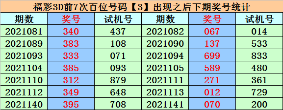 在百位号码3前7次开出之后,其下期分别开出号码:0、1、6、5、2、0、0,其中号码大小比为2:5,012路比为4:1:2,奇偶比为2:5。