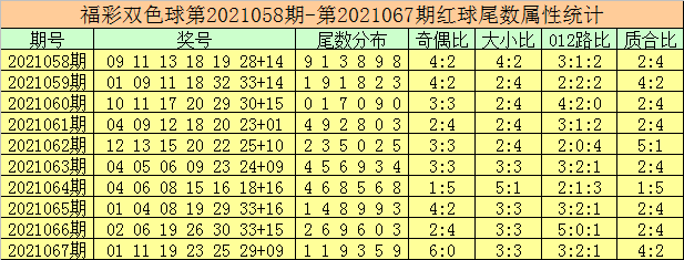 双色球第2021067期奖号为:01 11 19 23 25 29 + 09,其中红球尾数奇偶比为6:0,尾数大小比为3:3,尾数012路比为3:2:1,尾数质合比为4:2。