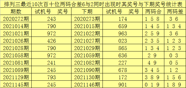 从以上统计可以看出,百十位两码合差6与2同时出现之后其下期两码合差表现最热的4个分别为:1359,本期百十位两码合差可以参考这四码中的数据。