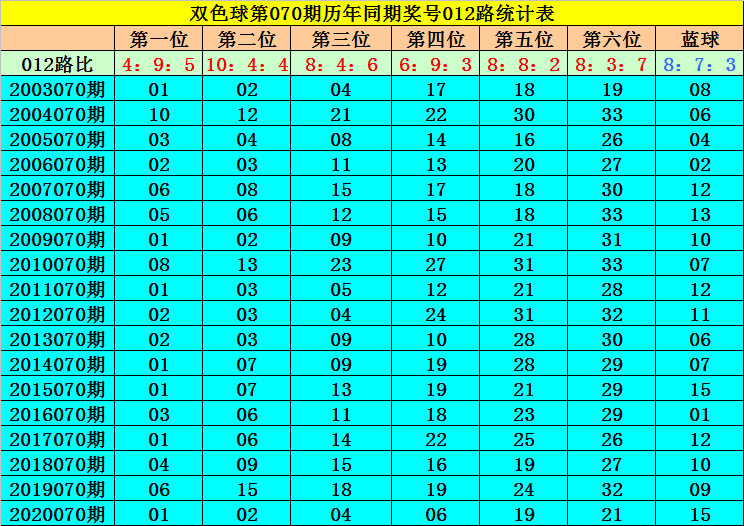 蓝球分析:在第070期历史同期开奖中,蓝球012路比为8:7:3,最近5年同期蓝球012路比为3:2:0,目前2路号码遗漏8年,今年同期排除2路蓝球,参考1路蓝球01。