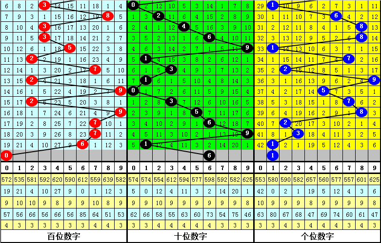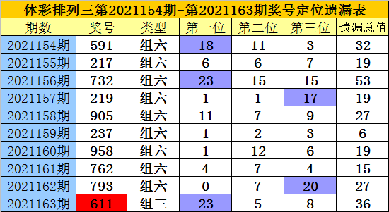 排列三第2021163期奖号为:611,各位号码遗漏值分别为23、5、8,遗漏总值为36。