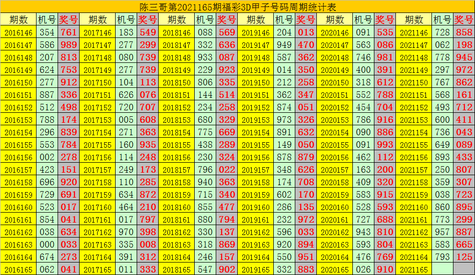 第2016年-第2020年的第148期奖号分别为:813、739、087、362、981,第2016年-2020年的第165期奖号分别为:041、333、902、883、910。其中: