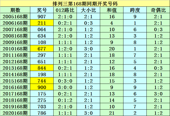 本期为排列三第2021168期开奖,开奖日期为:2021年6月27日,历史上排列三第168期已开出了16次奖号,历年同期开出号码分别为:907-211-064-634-108-677-297-651-844-198-744-900-175-275-703-786。