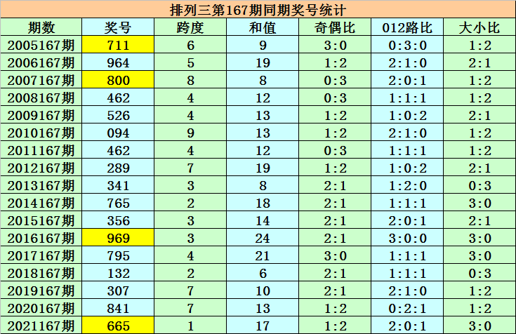 号码012路比:第168期历史同期号码012路比为17:21:10,本期预计012路比开出0:1:2。