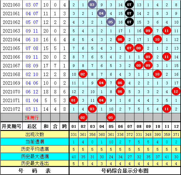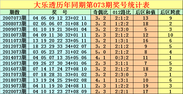 后区和值分析:历史同期第073期开奖中,后区和值奇偶比为8:6,基本相当,本期预计和值为奇数,参考7。