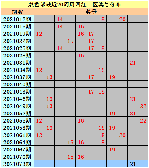 最近20个周四红二区18,表现最热,开出次数为7次,红球20、22,表现最冷,出现2次,上周四开出2个号15、16,本期该区参考号码:21。