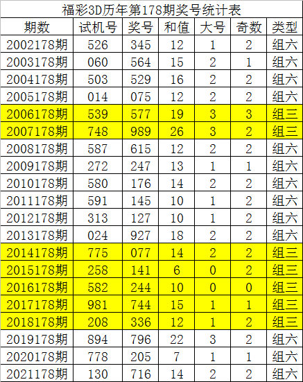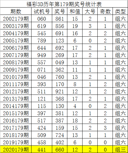 从以上统计可以看出,历年3D第179期开出了1次组三号码,开出了18次组六号码。组六号码出现概率大,本期预计开出组六号码。