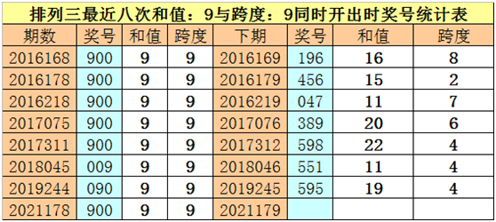 体彩排列三最近八次同时出现和值:9与跨度:9的奖号分别为:900、900、900、900、900、009、090、900,前七次下期开出奖号分别为:196、456、047、389、598、551、595,详见下表: