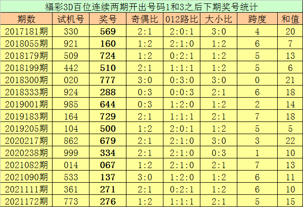 百位号码:连续两期百位出号分别为:1-3,历史上福彩3D连续两期前后分别出号1-3的奖号共出现84次。在百位1-3的奖号现象出现时,近15期下期分别出号:569-160-724-510-777-288-644-729-500-679-334-067-137-271-276;