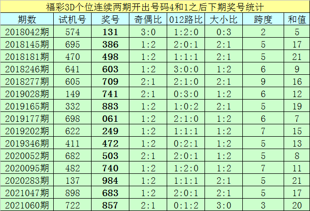 个位号码:最近两期个位开出号码为4-1,在福彩3D历史开奖中,前后两期个位分别开出号码4-1的奖号出现了69次。最近15期个位4-1组合出现之后,其下期奖号分别为:131-386-498-603-709-741-883-061-249-472-503-740-984-683-857;