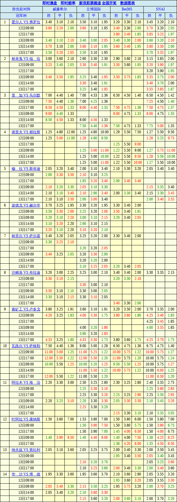 胜负彩21077期欧洲四大机构最新赔率(17:00)