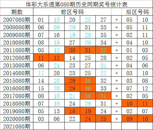 体彩大乐透第80期历史上已开出了14次,其奖号分别为: