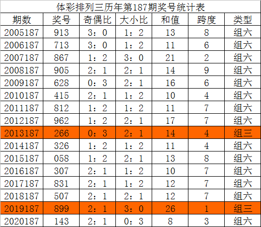 体彩排列三历年第187期开出奖号分别为:913、713、867、905、628、415、812、962、266、326、058、307、831、507、899、143。统计详见下表: