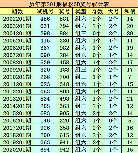 历年第201期福彩3D同期奖号为:581 - 794 - 884 - 380 - 982 - 284 - 458 - 188 - 700 - 348 - 803 - 498 - 363 - 905 - 320 - 358 - 615 - 941 - 942。