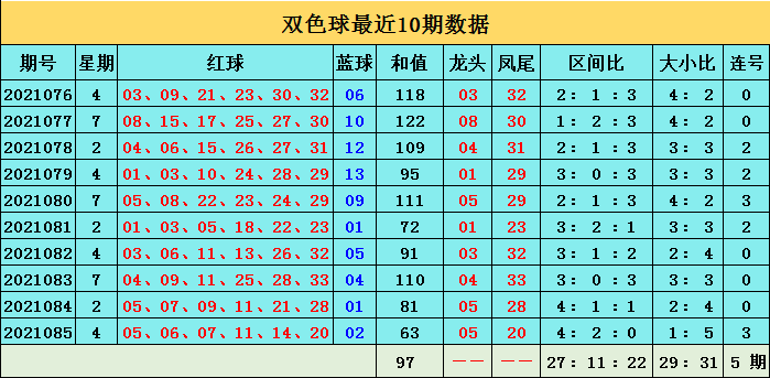 红球区间分布:上期红球三区比为4:2:0,一区号码05、06、07、11,二区号码14、20,三区号码断区,最近10期红球三区比为27:11:22,1区出号偏多。本期红球预计2区热出,区间比2:2:2。