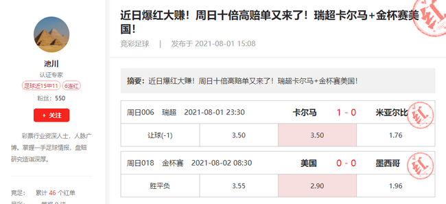 专家池川命中瑞典超卡尔马让平1赔3.5+美国墨西哥平局1赔2.9,擒获10倍二串一,火爆盈利!池川近3日盈利977%,今日方案不容错过!
