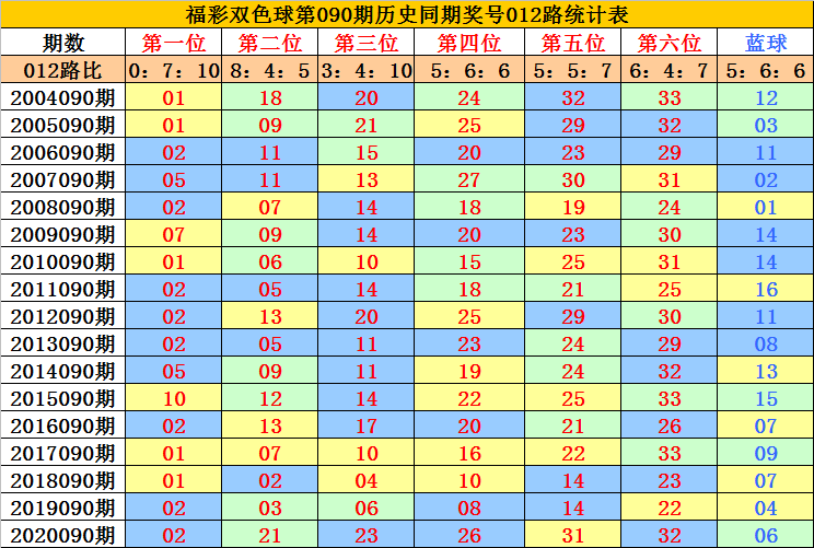 蓝球分析:第090期历史同期蓝球号码012路比开出5:6:6,在前9年同期奖号中,2路蓝球明显走冷,本期防2路蓝球再次轮空,关注蓝球03。
