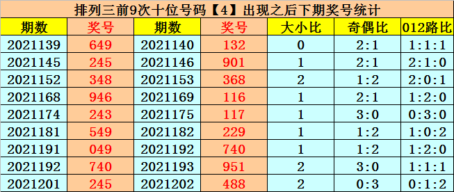 在十位前9次出现号码4后,其下期奖号分别开出:3-0-6-1-1-2-4-5-8,其中奖号个数012路比是3:3:3,奇偶比是4:5,大小比是3:6。