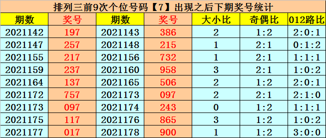 个位前9次开出号码7时,该位下期奖号分别为:6-5-2-8-6-7-3-5-0,其中号码个数奇偶比是4:5,大小比是6:3,012路比是4:1:4。