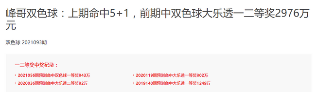 专家峰哥也是平台的佼佼者,他曾经命中过1次双色球一等奖和2次大乐透一等奖,总揽奖金额接近3千万!他在上期双色球预测中命中5+1,以一号之差错失头奖,相信今晚他将会再接再厉,拿下头奖!