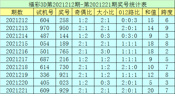 福彩3D第2021221期开奖号码为929,试机号为609,奖号类型为组三,奇偶比为2:1,大小比为2:1。