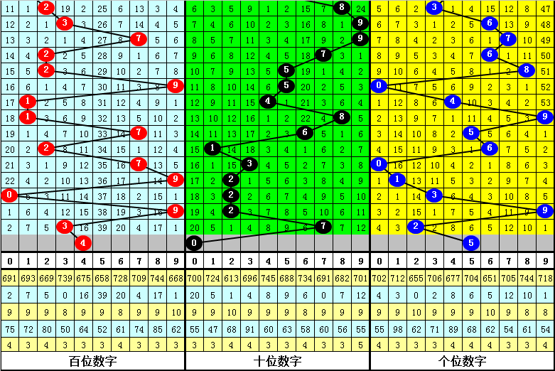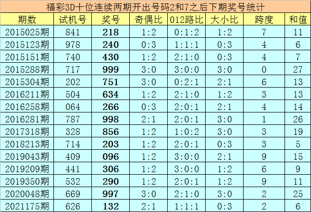 十位号码:前两期十位分别出现奖号2-7,历史上福彩3D连续前后分别开出号码2-7的现象共开出57次。在十位2-7的现象出现时,最近15期其下期分别开出号码:218-240-430-999-751-634-266-998-856-203-096-306-290-997-132;