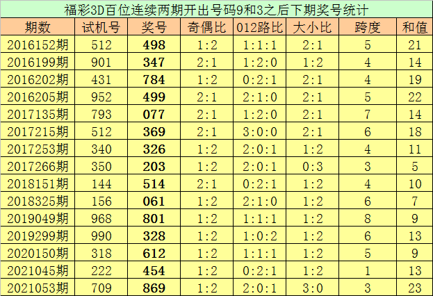 百位号码:连续两期百位出号分别为:9-3,历史上福彩3D连续两期前后分别出号9-3的奖号共出现72次。在百位9-3的奖号现象出现时,近15期下期分别出号:498-347-784-499-077-369-326-203-514-061-801-328-612-454-869;