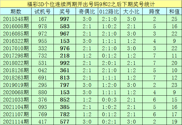 个位号码:最近两期个位开出号码为9-2,在福彩3D历史开奖中,前后两期个位分别开出号码9-2的奖号出现了65次。最近15期个位9-2组合出现之后,其下期奖号分别为:997-583-967-153-976-218-992-361-813-797-153-852-385-782-577;