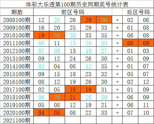 体彩大乐透第100期历史上已开出了13次,其奖号分别为:
