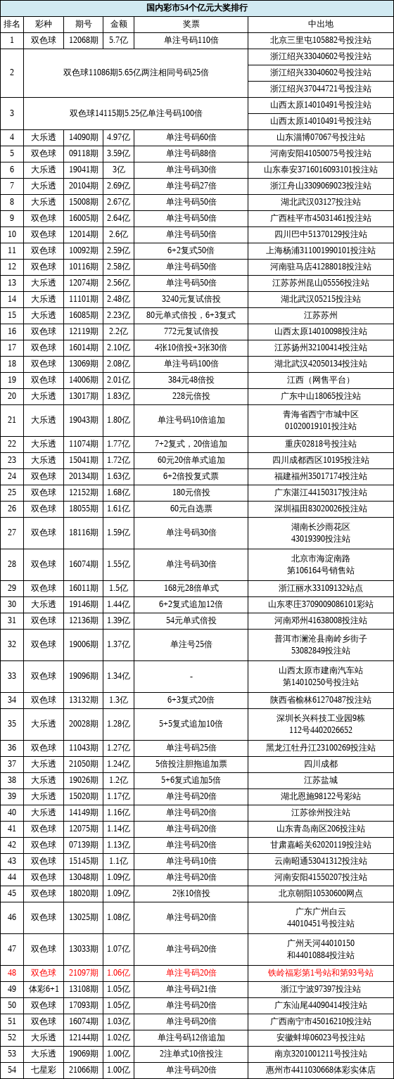 这是国内目前开出的第54个亿元奖,本次双色球1.06亿元排名第48。
