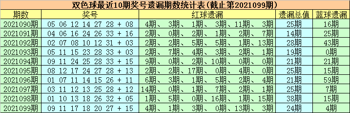 福彩双色球第2021099期开奖号码为:09 11 17 18 20 27 + 15,其中红球奖号遗漏期数分别为4期、1期、3期、0期、13期和3期,红球遗漏总期数为24期,蓝球遗漏4期。