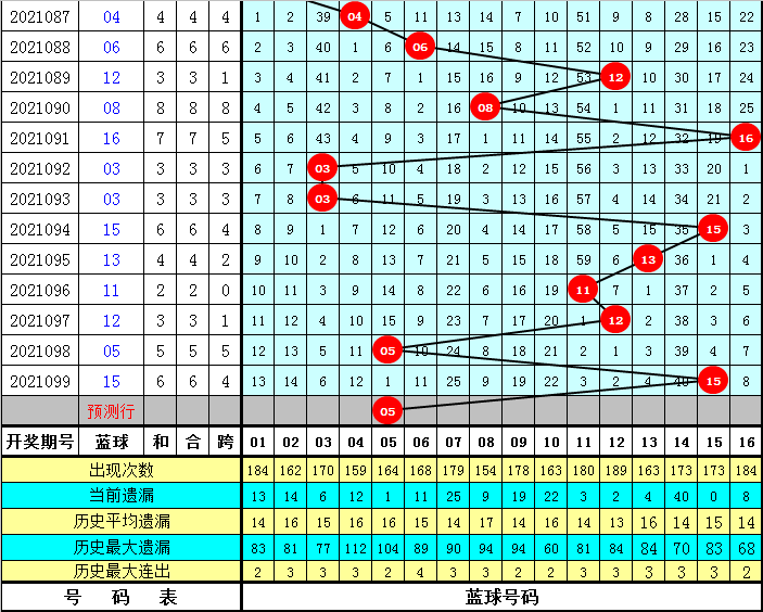 蓝球遗漏分析:最近20期蓝球冷温热码个数比为9:5:6,最近10期蓝球冷温热码个数比为7:1:2,上期开出热码蓝球15,遗漏4期,本期预计热码蓝球再出,关注蓝球号码05。