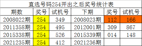 从以上统计可以看出,直选号码254出现之后,其下期奖号:1.下期全奇全偶组合没有出现;2.下期小号出现概率100%;3.下期质数出现概率100%;